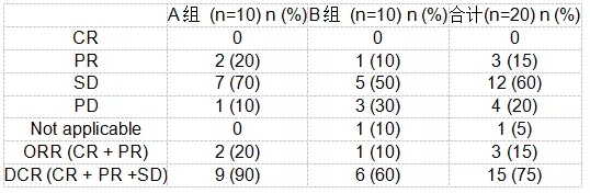 结果显示,迄今入组20例患者(每组10例),中位年龄47岁。既往接受系统治疗的中位次数是3。最常见的3级以上药物相关不良反应是高血压(A组3/10,B组0/10)、蛋白尿(A组2/10,B组0/10)。通过适当的支持治疗,减少药物剂量和/或暂时停药,3级以上药物相关不良反应都可控。A组的ORR为20%,B组为10%。A组的DCR为90%,而B组为60%。截至本文发表之日,仍有2例患者接受AL3810治疗,其中1例在A组,部分缓解持续>32个月。具体疗效结果如下所示。