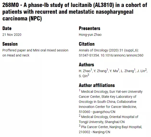 268MO- lucitanib(AL3810)治疗复发和转移性鼻咽癌(NPC)的Ⅰb期研究