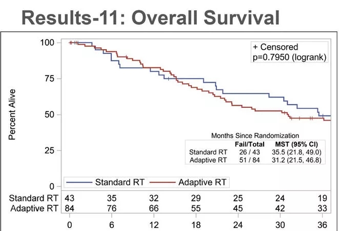 ≥3级或更严重的放疗相关AE在两组间无显著性差异:肺毒性(标准组5.3% vs. 适应性组6.9%)、食管炎(7.9%vs.3.8%)以及心脏毒性(2.6%vs.1.3%),但自适应组的2级食管炎发生率在数值上更高(42.5%vs.31.0%)。