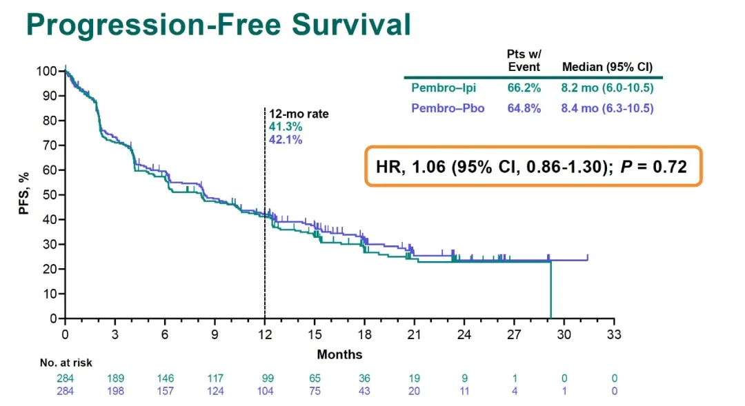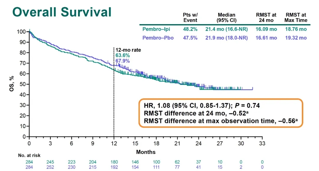 第一次中期分析已经显示OS与无进展生存期(PFS)研究结果的无效性。此次报道的结果显示,20.6个月的中位随访后,帕博利珠单抗/伊匹木单抗组的中位OS达到21.4个月,而帕博利珠单抗/安慰剂组的中位OS为21.9个月(HR=1.08;95%CI:0.85-1.37;P=0.74)。两组限制平均生存时间(restricted mean survival time)的差异在最大观察时间为-0.56,在24个月为-0.52,均符合无效标准(最大观察时间≤0.2,24个月≤0.1);