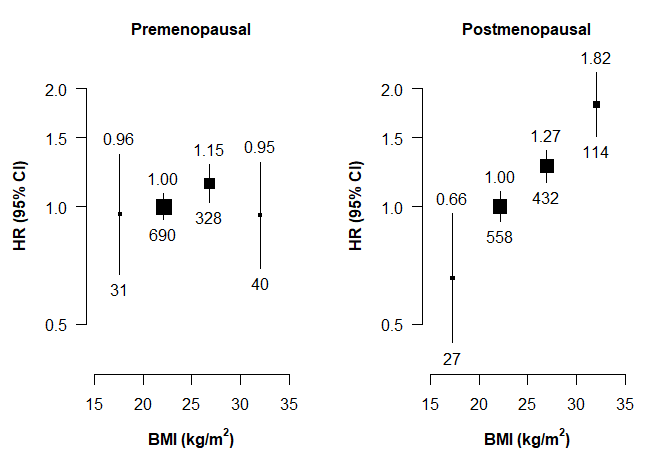△基线时校正后的绝经前和绝经后妇女的HRs和BMI。黑点以上的数字是HR,以下的数字是病例数。