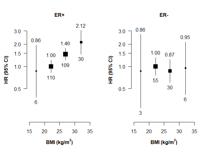 △校正后的绝经后ER+和ER-女性乳腺癌的HRs和BMI