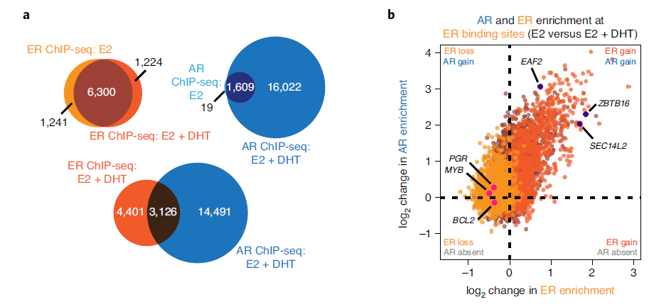 进一步探究AR激活在ER+乳腺癌中的抗增殖作用机制,在雌激素依赖性ZR-75-1人乳腺癌细胞系(该细胞系内源性表达两种受体,且体外试验中其增殖受雄激素抑制)中通过染色质免疫共沉淀技术(ChIP-seq)在染色质水平上研究AR与ER之间的功能相互作用。结果显示AR的激活并不能整体改变ER结合位点(ERBS)的数量,但显著增加了AR结合位点(ARBS)的数量。独立试验显示,仅用DHT处理,几乎可诱导出E2+DHT处理时检测到的所有ARBS。当两种受体都被激活时,AR被募集到所有ERBS的42%,这表明AR激活有直接影响ER相关基因转录活性的潜力。