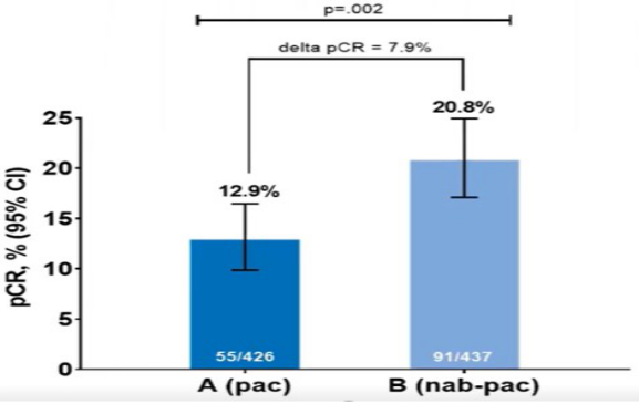 试验中关于诱导治疗部分(内分泌治疗:绝经前:三苯氧胺,20mg/天;绝经后:来曲唑 2.5mg/天、阿那曲唑1mg/天或依西美坦25mg/天);试验中关于化疗部分(化疗A组:紫杉醇175mg/m2,q2W×4→表柔比星90mg/m2+环磷酰胺600mg/m2,q2W×4;化疗B组:白蛋白结合型紫杉醇125mg/m2,q1W×8→表柔比星90mg/m2+环磷酰胺600mg/m2,q2W×4)。研究结果显示,白蛋白结合型紫杉醇与紫杉醇相比具有显著升高的pCR。