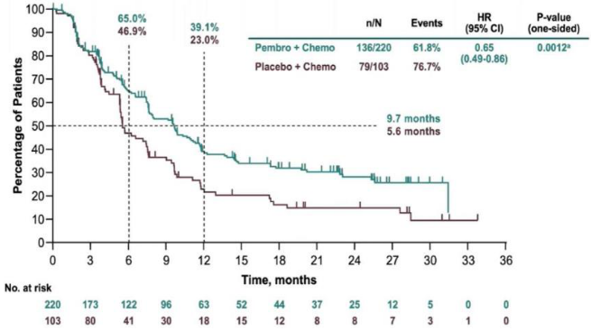 KEYNOTE-355研究是一项国际多中心、双盲、安慰剂、随机对照的Ⅲ期临床研究,按2:1随机分组:帕博利珠单抗+化疗组566例(白蛋白结合型紫杉醇、紫杉醇或吉西他滨+卡铂);安慰剂+化疗组281例(白蛋白结合型紫杉醇、紫杉醇或吉西他滨+卡铂)。该研究主要疗效评估终点是PD-L1 CPS≥10和CPS≥1两组患者以及意向治疗人群的PFS和OS。研究显示,在肿瘤表达PD-L1且合并阳性评分(CPS≥10)的患者中,与安慰剂+化疗比较,帕博利珠单抗+化疗使PFS实现了统计学意义显著延长(中位PFS:9.7个月VS 5.6 个月);将疾病进展显著降低了35%(HR=0.65;95%CI:0.49~0.86;P=0.0012)。目前研究仍在继续进行随访,评估总体生存率。