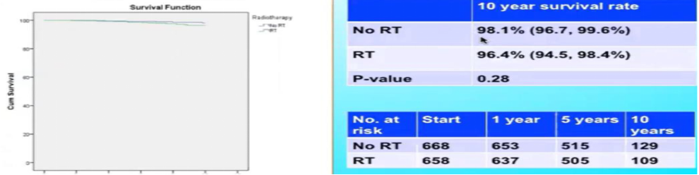 PRIME 2研究是一项多中心、随机、开放标签的Ⅲ期临床试验,纳入了1326例65岁以上被判定为低风险(激素受体阳性、pT1-2(<3cm)、组织学分级3级或淋巴脉管侵犯)早期乳腺癌,接受保乳手术并接受辅助内分泌治疗。符合条件患者被随机分为全乳放疗组(40-50Gy, 15-25次)和不放疗组。评估“低风险”老年患者在保乳术和辅助内分泌治疗后省略术后全乳放疗,10年期间对其疾病局部控制的影响。结果显示未给予术后全乳放疗组10年IBTR(同侧乳房复发)为9.8%,而放疗组为0.9%。