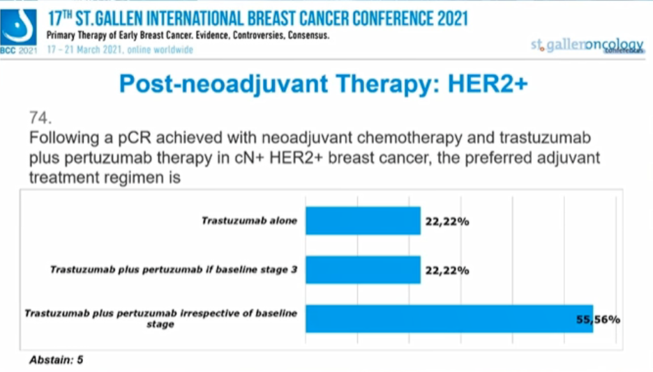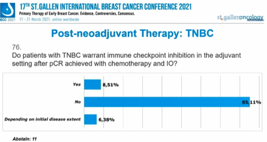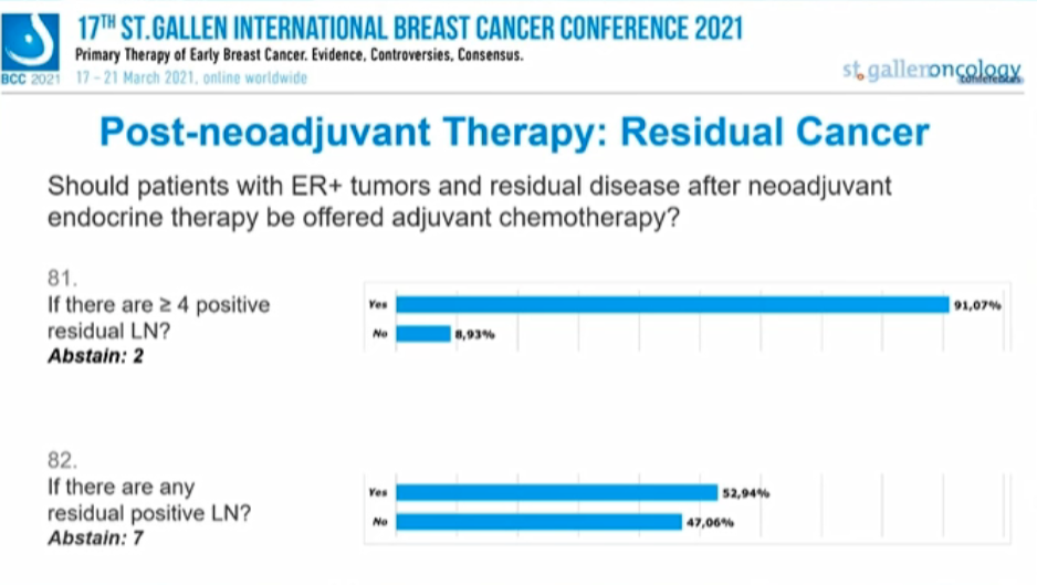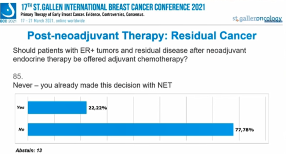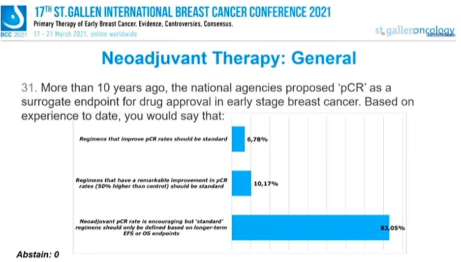 编者按:当地时间3月20日,在Eric Winner教授的主持下,第十七届圣加伦国际乳腺癌大会(SG-BCC 2021)的专家完场了首场投票,本文总结“新辅助治疗”以及“新辅助治疗后”的专家投票结果。
