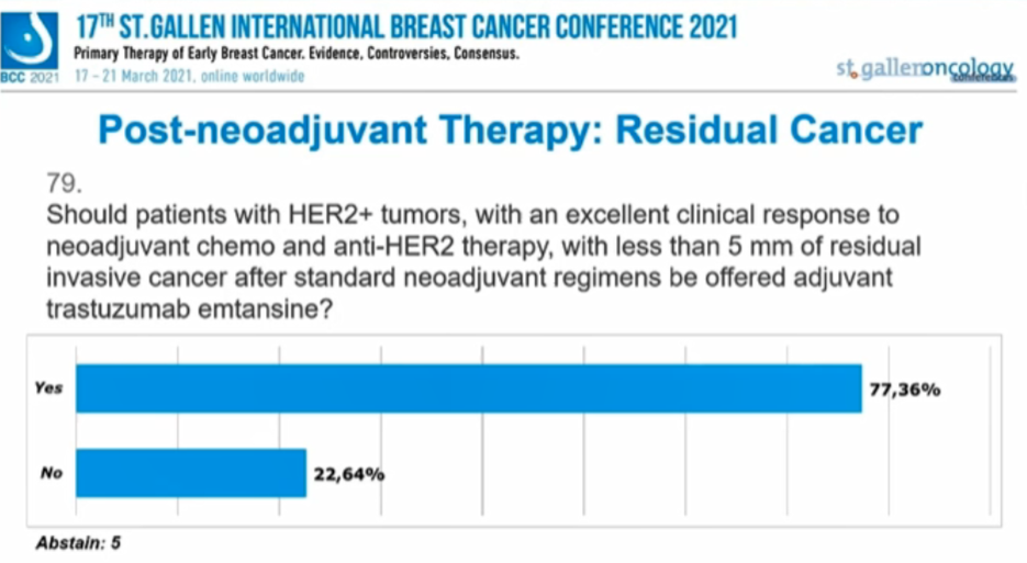 对新辅助化疗+抗HER2治疗临床反应很好,新辅助后残存疾病<5m +的患者,是否应给予T-DM1辅助治疗?