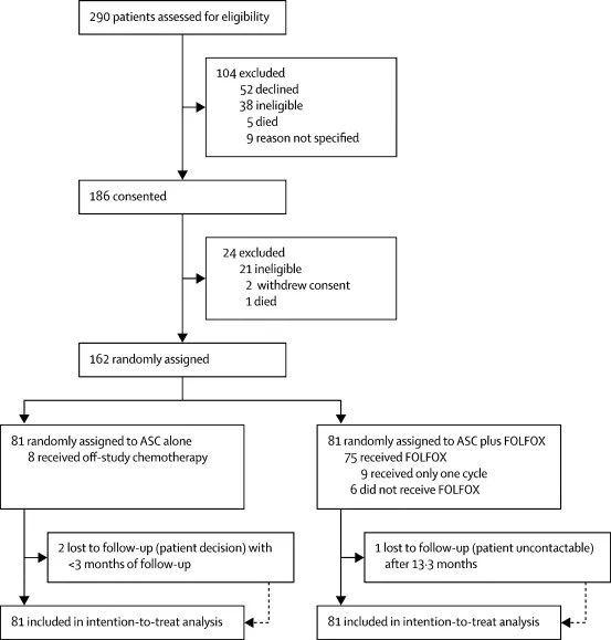 研究结果:2014年3月27日至2018年1月4日,162例患者被纳入研究并随机分配接受ASC+FOLFOX(n=81)或单独ASC(n=81)。中位随访时间为21.7个月(IQR 17.2~30.8)。