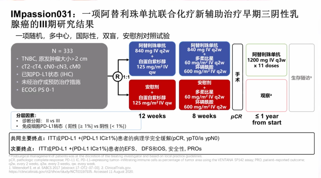 IMpassion031研究是一项多中心,随机,双盲的Ⅲ期临床研究,旨在评估阿替利珠单抗联合化疗在早期TNBC新辅助治疗中的疗效和安全性。该研究结果显示,阿替利珠单抗联合化疗组和安慰剂联合化疗组分别有57.6%和41.1%患者观察到pCR(P=0.0044),次要研究终点PD-L1阳性患者与ITT人群pCR获益一致(68.8% vs 49.3%,P=0.021)。无论PD-L1状态如何,阿替利珠单抗联合化疗作为术前新辅助治疗,都能带来更高的pCR率,且安全性可接受。但很遗憾,该研究并未使我们看到生存方面的获益。