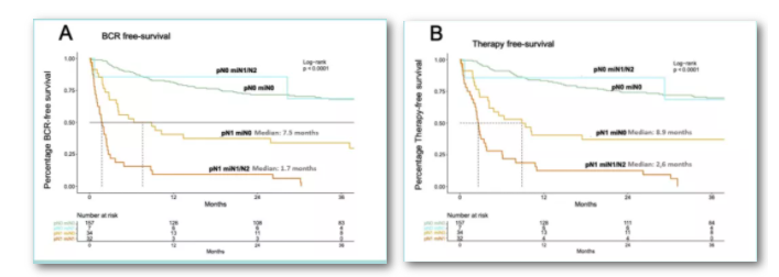 图4. 组织学(淋巴结)及影像学(PSMA-PET)不同分层的BCR生存和无治疗生存