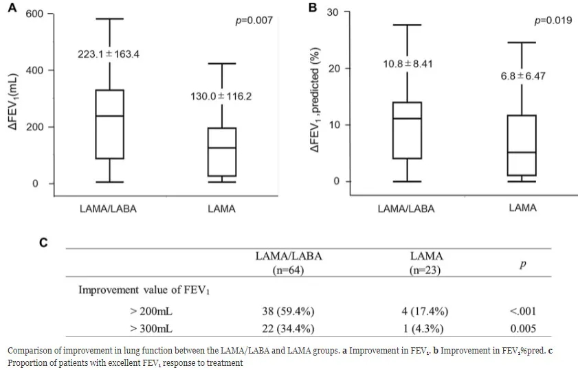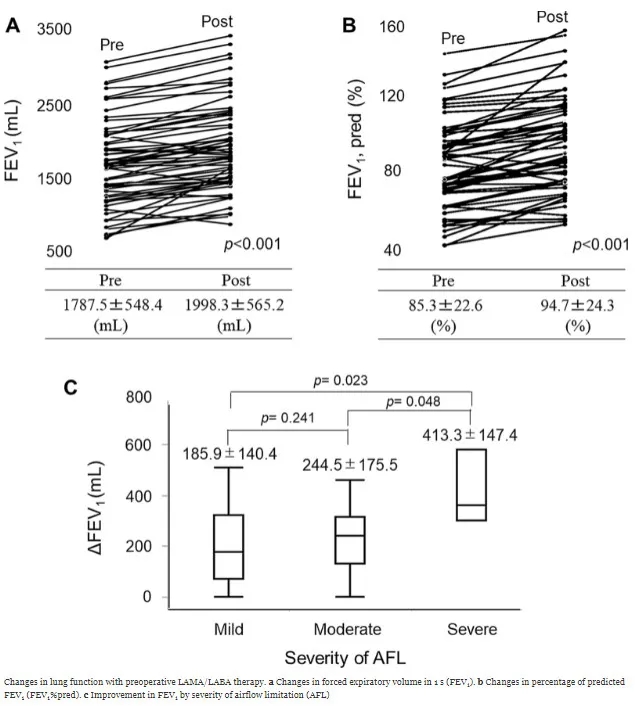 研究人员报告说,在肺癌手术前接受术前LAMA/LABA治疗的患者中,1秒用力呼气量(FEV1)和FEV1预测值显著改善(两者P<0.001)。与术前接受LAMA治疗的患者相比,LAMA/LABA联合治疗显著改善了肺功能(FEV1,223.1 mL vs 130 mL;FEV1预测值百分比: 10.8% vs 6.8%)。
