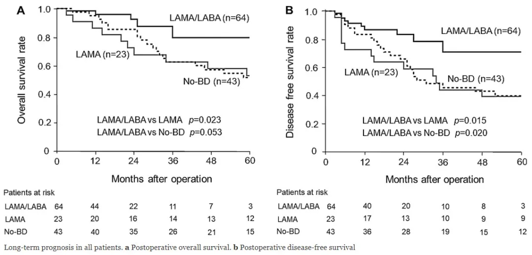与仅接受LAMA的患者相比,接受LAMA/LABA联合治疗患者的术后并发症的发生率较低(P=0.007);LAMA/LABA治疗的患者的所有并发症(21.9% vs 52.2%)、肺炎(10.9% vs 26.1%)、急性呼吸衰竭(1.6% vs 8.7%)、长期漏气(9.4% vs 21.7%)和心房颤动(6.3% vs 8.7%)的发生率更低。