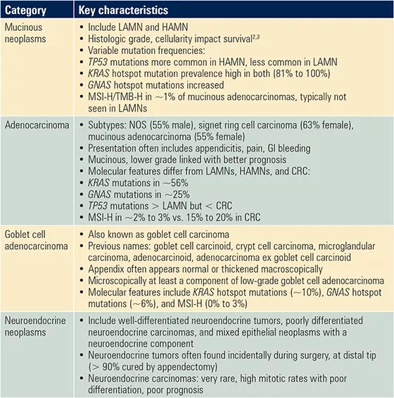 Abbreviations: CRC, colorectal cancer; GI, gastrointestinal; HAMN, high-grade appendiceal mucinous neoplasm; LAMN, low-grade appendiceal mucinous neoplasm; NOS, not otherwise specified; MSI-H, high-level microsatellite instability; TMB-H, high tumor mutational burden.