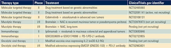 Bahary教授指出,阑尾癌与结肠癌不同,需要新的治疗模式。目前,研究人员正在开发的新疗法采用多种方法,包括分子靶向治疗。GNAS在杯状细胞癌中表达相对较低,而在腹膜黏液腺癌和假黏液瘤中表达较高。与印戒细胞癌和结直肠癌相比,KRAS在假性黏液瘤、腹膜和黏液腺癌中更容易发生突变[4]。用黏液溶解疗法治疗可以减少保护肿瘤细胞的黏液数量,可能会增强药物的渗透力。经腹腔注射菠萝蛋白酶和n -乙酰半胱氨酸治疗后,患者的黏液明显减少[5]。一些试验也将研究对阑尾癌的免疫治疗和溶瘤病毒治疗(表2)。