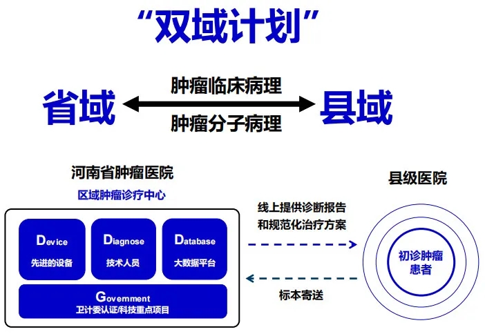 “双域计划”的具体实施过程:⑴遴选第一批试点县级医院,开展试点。⑵授牌各病理分中心,委托诊断病理项目,目前基本覆盖肿瘤治疗所需的所有病理诊断项目,包括疑难病例会诊、冰冻切片远程会诊、EGFR等40余项基因检测项目、免疫组化及FISH检测项目。⑶通过座谈讨论、现场指导和实地调研等形式普及精准医学知识和相关规范。⑷肺癌基因检测标准化也有助于提升各级医院的肺癌基因检测能力及质量,2021年3月,河南省肿瘤医院与河南省7家三级医院、21位临床及病理专家共同开启肺癌患者基因检测标准化项目(GDP)。