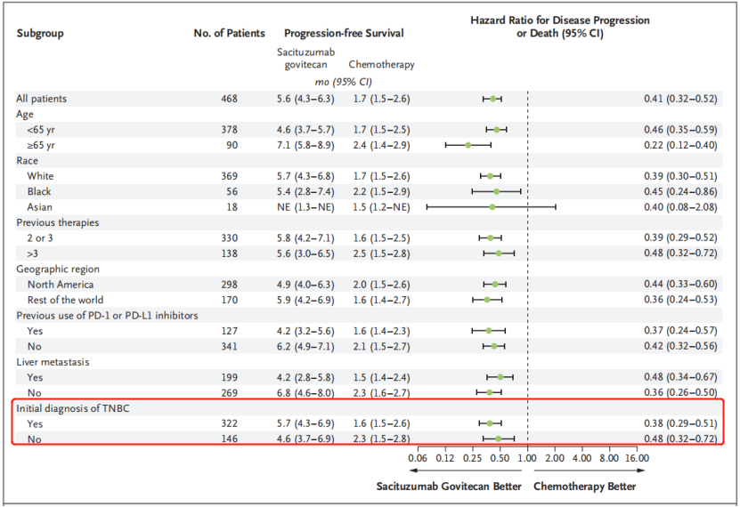 2021年ASCO报道的ASCENT研究二线亚组分析,即(新)辅助化疗后12个月内发生复发进展并接受一种转移性疾病治疗方案的患者,接受戈沙妥珠单抗治疗的ORR(30% vs 3%)、PFS(HR 0.41)和OS(HR 0.51)均较化疗有显著改善。