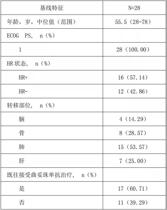 ■ 研究方法:本研究是一项前瞻性、单臂、多中心的临床研究,从2020年4月~2021年6月,共入组28例晚期一线HER2阳性复发/转移性乳腺癌患者。所有患者均接受吡咯替尼联合曲妥珠单抗加白蛋白结合型紫杉醇治疗。主要研究终点为无进展生存期(PFS);次要研究终点为总生存期(OS)、客观缓解率(ORR)、疾病控制率(DCR)、疗效持续时间(DoR)、临床获益率(CBR)和安全性。