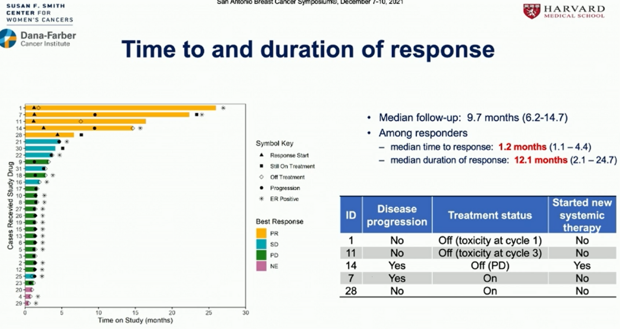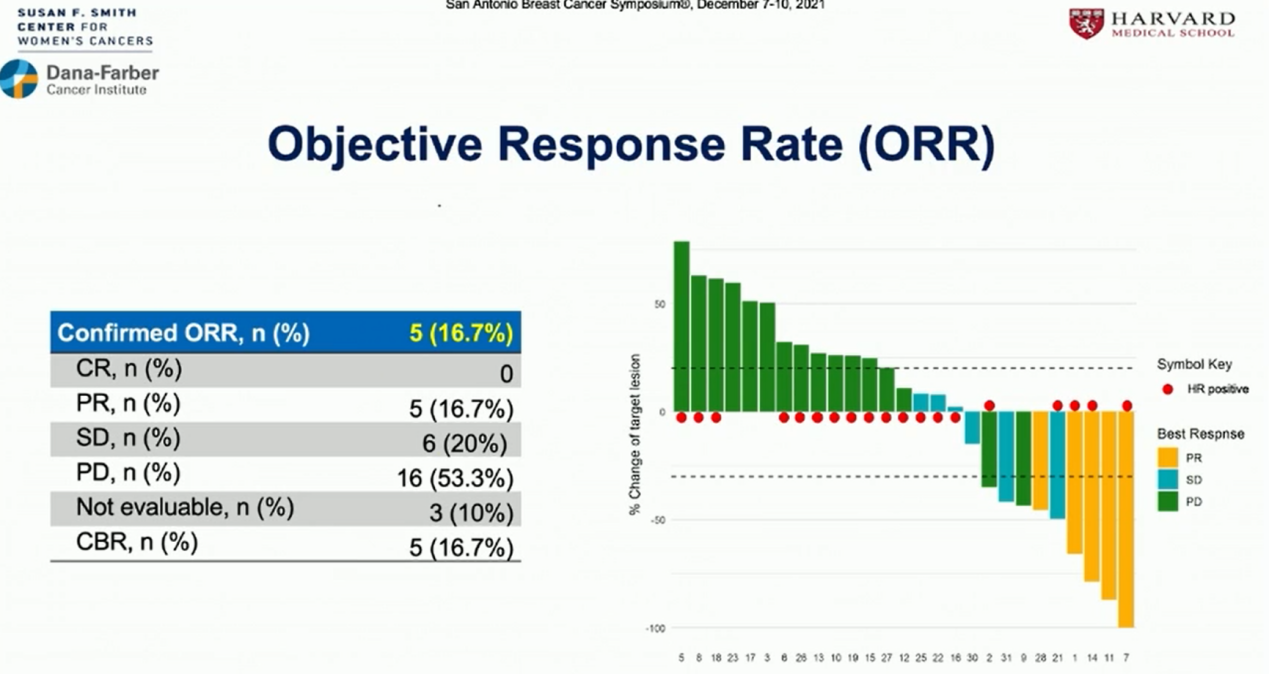 ■ 研究结果:2019年2月至2021年6月,来自3个不同学术机构的31例患者被纳入该研究。在30名开始研究治疗的患者中,中位年龄为63岁,21名激素受体阳性(HR+)乳腺癌,9名三阴性乳腺癌(TNBC),化疗中位线数为1.5(0-3)。在9例TNBC患者中,7例PD-L1状态已知(3例阳性,4例阴性)。中位TMB为10.9 Mut/Mb,16.7%(n=5)患者的TMB≥14 Mut/Mb。