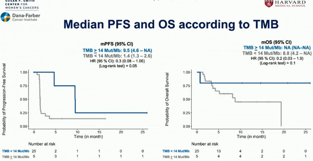 中位PFS和OS分别为1.4月(95% CI:1.3~9.5)和19.3月(95% CI:4.2~NE),其中TMB≥14 mut/Mb和<14mut/Mb组PFS分别为(9.5m vs 1.4m)存在显著性统计学差异,OS分别为(NA vs 8.8m),高突变亚组有延长趋势。取得PR和SD患者12月生存率分别为100%和80%。同时该治疗毒副反应部分令人满意,只有3例患者发生3级免疫相关不良事件(1例肾上腺机能不全和心脏肌钙蛋白升高,另外2例免疫性肝炎)。无4-5级事件报告。有关TIL、PD-L1和CD8免疫组化的数据将后续报道。