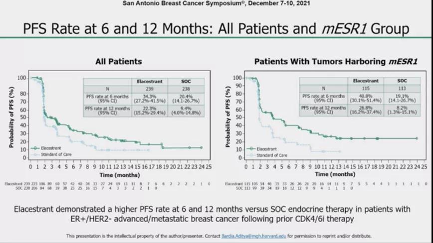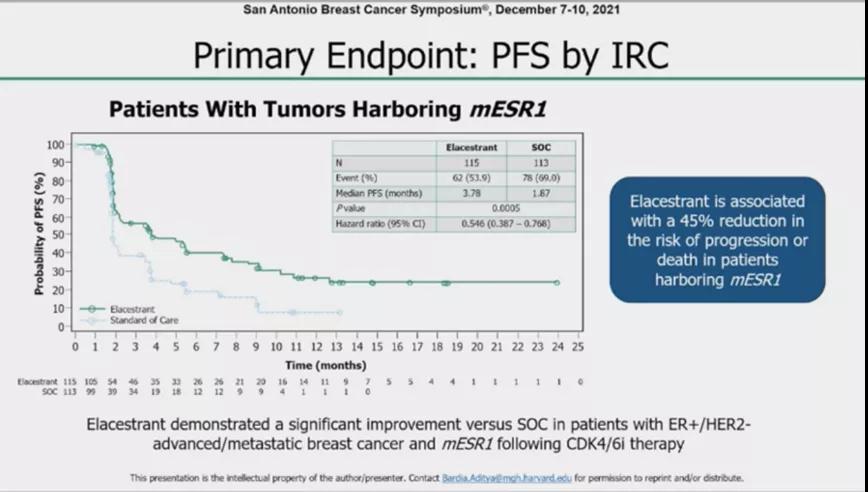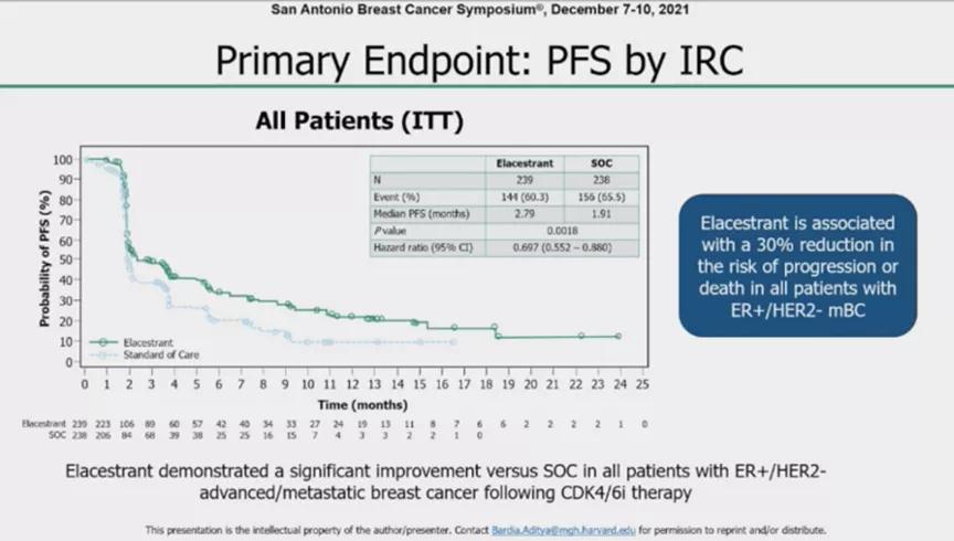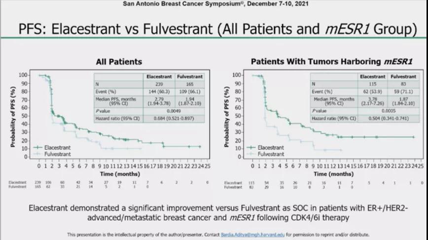 主要研究终点:总人群中艾拉司群组与标准治疗组相比较,中位PFS 2.79月vs 1.91月,疾病进展或死亡风险下降30%(HR=0.697 [95% CI: 0.552~0.88];P=0.0018),ESR1突变人群的艾拉司群组与标准治疗组相比较,中位PFS 3.78月vs 1.87月,疾病进展或死亡风险下降45%(HR=0.546 [95% CI:0.387~0.768];P=0.0005)。