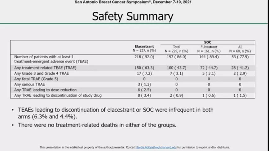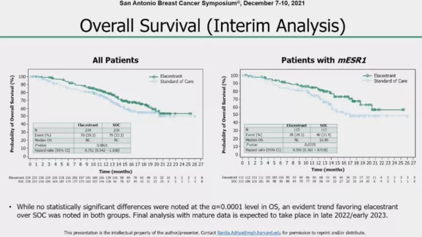 各关键预设亚组(内脏转移、既往治疗线数、既往接受氟维司群治疗等)与总体结果趋于一致。艾拉司群组对比标准治疗组的总人群12个月无进展生存率为22.32%(95% CI:15.24%~29.40%)vs 9.42%(95% CI:4.02%~14.81%),艾拉司群组对比标准治疗组的ESR1突变人群12个月无进展生存率为26.76%(95% CI:16.17%~37.36%)vs 8.19%(95% CI:1.26%~ 15.12%)。预设的中期OS分析显示艾拉司群组在总人群(HR=0.751 [95% CI: 0.542~1.038];P=0.0821)和ESR1突变人群(HR=0.592 [95% CI:0.361~0.958];P=0.0325)均占优势。最终OS分析结果预计将在2022年出炉。