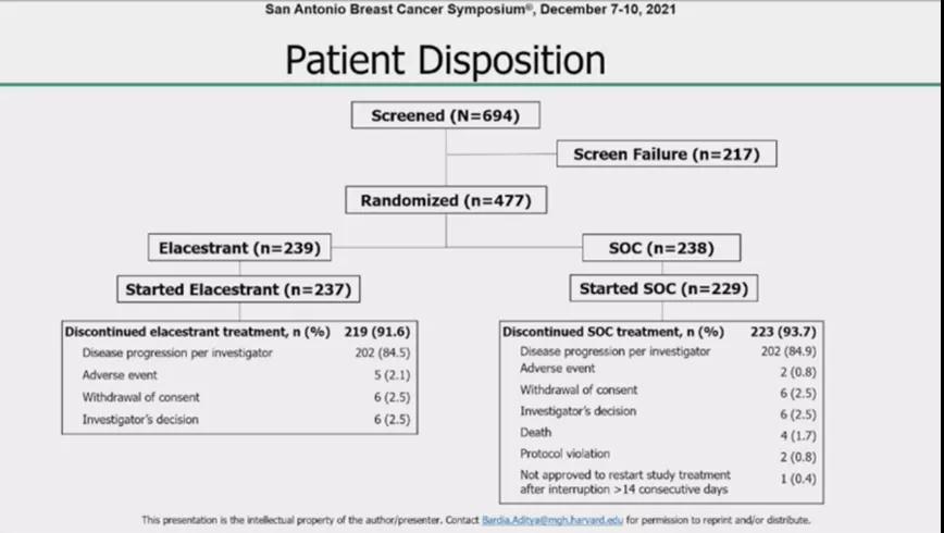 研究结果显示,2019.02至2020.10入组477名患者(包含228名ESR1突变人群),艾拉司群组和标准治疗组的人数分别为239名和238名。两组患者的基线人口学特征和疾病特征比较均衡:中位年龄为63岁 vs 63.5岁、既往两线治疗为 46% vs 40.8% 、两组患者均接受过CDK4/6抑制剂的治疗。