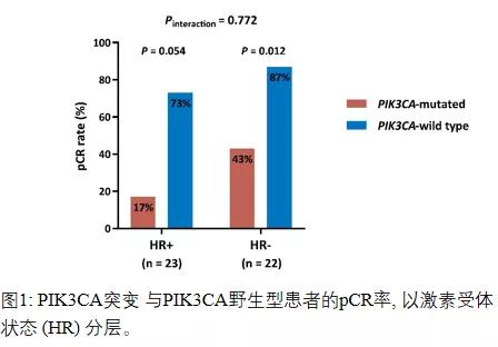 在所有突变基因中,只有PIK3CA与pCR显著相关,野生型PIK3CA患者的pCR率显著高于携带PIK3CA突变的患者(80.8% vs. 26.3%;odds ratio [OR],0.09;95% CI,0.02~0.35;P= 0.00057),见表2。