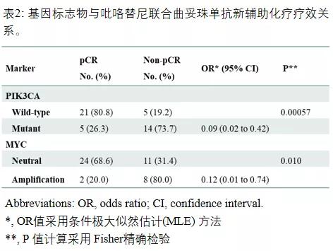 PIK3CA突变和MYC 扩增与HER2阳性乳腺癌吡咯替尼联合曲妥珠单抗新辅助化疗病理完全缓解(pCR)相关