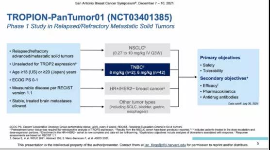 TROPION-PanTumor01研究Dato-DXd在TNBC患者中的应用,2021年1月8日第一次分析数据,通过盲目独立中心评估的在可评估的21例接受Dato-DXd[6 mg / kg(n = 19)或8 mg / kg(n = 2)]治疗的患者中,初步客观缓解率(ORR)为43%。观察到5个已确认的完全或部分缓解(CR / PR),还有4个正在等待确认的CR / PR。疾病控制率高达95%。