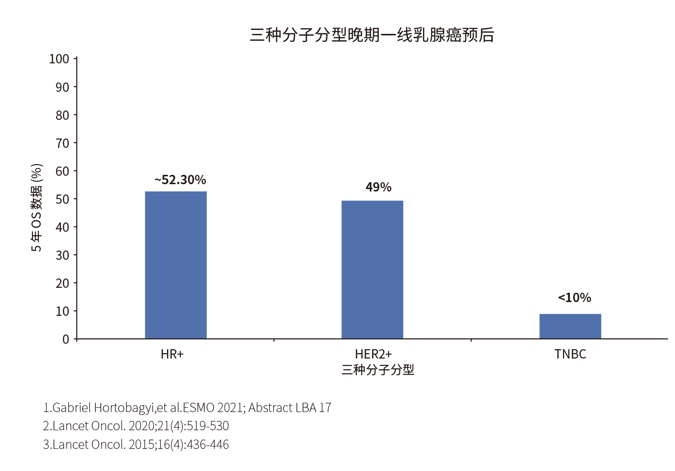 Δ不同分子分型乳腺癌早期和晚期(一线)5年OS率