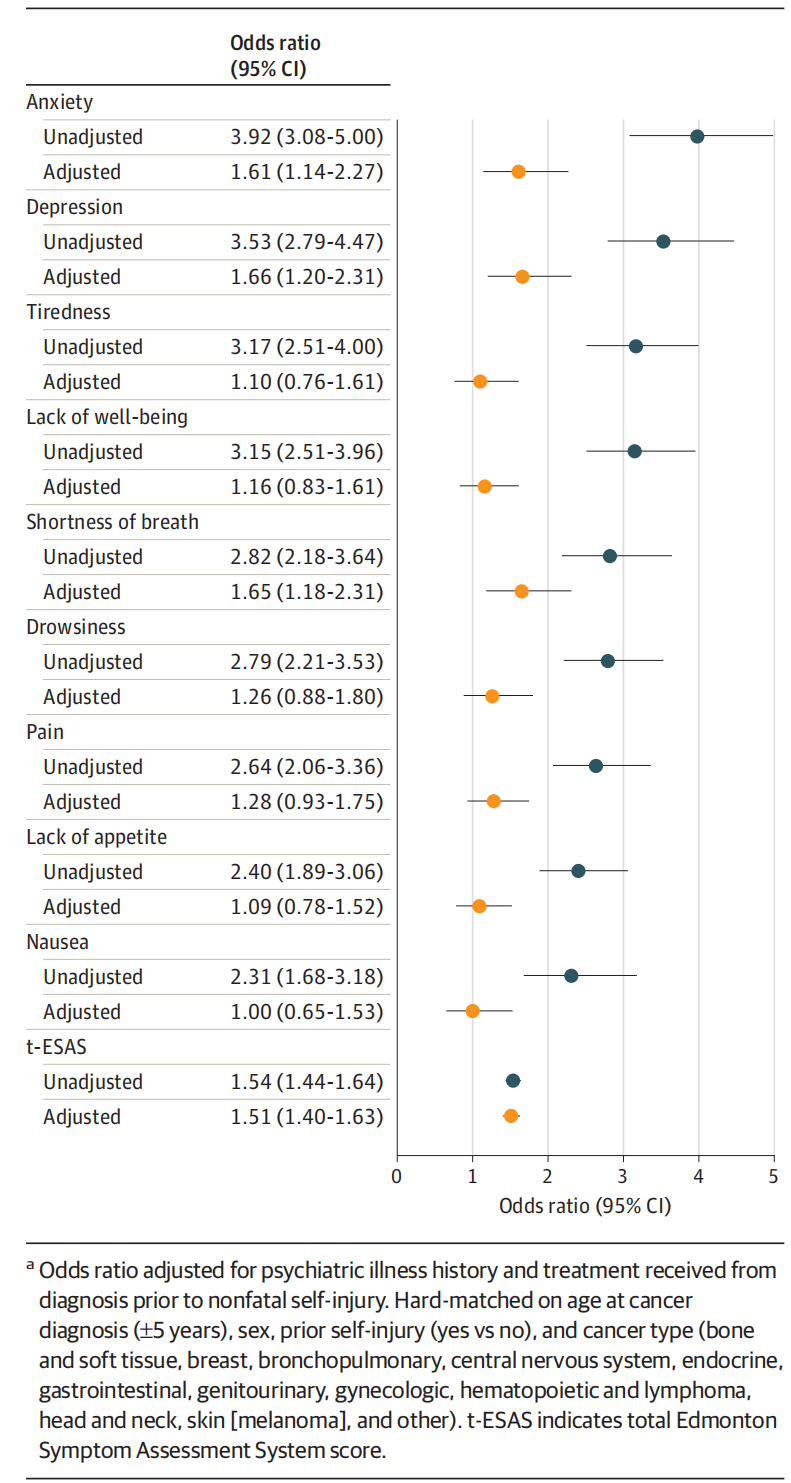 2、Noel CW, Eskander A, Sutradhar R, et al;Enhanced Supportive Psycho-oncology CanadianCare (ESPOC) Group. Incidence of and factors associated with nonfatal self-injury after a cancer diagnosis in Ontario, Canada.JAMA Netw Open.2021;4(9):e2126822. doi:10.1001/jamanetworkopen.2021.26822