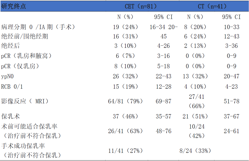 研究结果:随机入组134例女性患者,其中122例可评估,38%为绝经后,62%为绝经前或围绝经期;Ⅱ期69%,Ⅲ期31%;组织学分级2级74%,导管癌84%,平均肿瘤直径45mm(MRI)。主要研究终点(病理分期为0或ⅠA比例):CET组和CT组分别为24%和20%。次要研究终点:CET组和CT组乳房及腋窝均pCR率分别为7%和0%;仅乳房pCR率分别为10%和0%;ypN0分别为32%和0%;RCB 0/1分别为19%和10%;保乳率分别为46%和51%(见下表)。安全性:联合组发热性中性粒细胞减少率较高(11%和4%),但周围神经毒性较低(3%和7%)。
