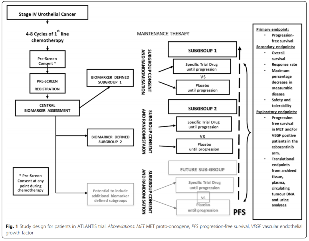 ATLANTIS是英国第一个采用精确医学方法对尿路上皮癌患者进行维持治疗的多中心、伞状II期研究,具有阳性疗效信号的药物将进入随机III期试验。该研究纳入人群为IV期尿路上皮癌患者,先给予4-8周期的一线化疗,然后在生物标志物的指导下选择用于维持治疗的药物,比如根据MET和VEGF表达选择卡博替尼,根据LOH、HRD等基因改变选择PARP抑制剂Rucaparib,根据AR表达选择新型内分泌治疗恩扎卢胺。研究的主要终点是PFS,次要终点包括OS、缓解率、安全性和耐受性等。本次ASCO会议上将报告卡博替尼维持治疗的研究结果。