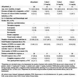 共纳入36例患者,截止日期时仍有35例(97.2%)患者在继续研究治疗,1例(2.8%)因不良事件(AE)死亡,与belamaf不相关。患者中位年龄72.5岁(64.0-86.0),具有可用数据(30[83.3%])患者中,修订后国际分期系统期I、II和III期分别为6例[20.0%]、21例[70.0%]和3例[10.0%],3例[10.0%]具有高危细胞遗传学(即del17p13,t(4,14),t(14,16))。中位治疗持续时间4.2个月(0.5-11.9),中位周期数5.0(1.0-11.0)。22例(61.1%)患者发生至少1次3-4级AEs,1例(2.8%)患者经历了与belamaf无关的5级AE(肺炎)。最常见的(≥1.0%患者)3-4级AEs是疲劳(13[36.1%]),视力降低(6[16.7%])和皮疹(5[13.9%])。未发生3-4级血小板减少和感染以及输注相关反应(表)。发生1-2级眼部症状、视力降低和角膜病的患者分别为27(75.0%)、21(58.3%)和18(50.0%)。发生3-4级眼部症状、视力降低和角膜病患者分别为0(0.0%)、5(13.9%)和0(0.0%)。所有患者中28例(77.8%)可评估疗效(表),中位随访4.2个月(0.5-11.9),总缓解率96.4%(27/28例,完全缓解[CR]:14.3%[4/28例],VGPR:35.7%[10/28例],部分缓解[PR]:46.4%[13/28例]),无疾病进展。达到VGPR患者中,6/10(60.0%)血/尿免疫固定电泳阴性。达到≥PR的中位时间1.0个月(0.9-2.0)。