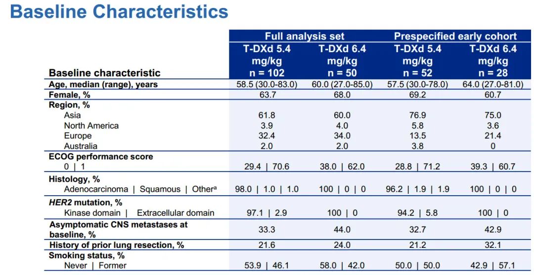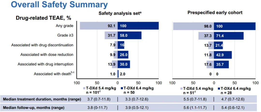 截止2022年3月24日,对预先设定早期队列(Prespecified early cohort)中分配接受5.4mg/kg T-DXd的52例患者和接受6.4mg/kg的T-DXd的28例患者进行了评估。在安全性分析集中,101例患者被分配接受5.4mg/kg方案,50例患者被分配接受6.4mg/kg方案。