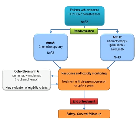 本研究纳入的人群为至多接受过1线解救化疗的ER阳性/HER2阴性转移性乳腺癌患者。患者被随机分至两组,分别接受化疗(脂质体阿霉素+环磷酰胺)和化疗联合nivolumab+ipilimumab治疗。研究的主要终点为安全性和无进展生存期(progression-free survival,PFS),次要终点为总生存期(overall survival,OS),客观缓解率(objective response rate,ORR),临床获益率(clinical benefit rate,CBR)和生物标志物分析。