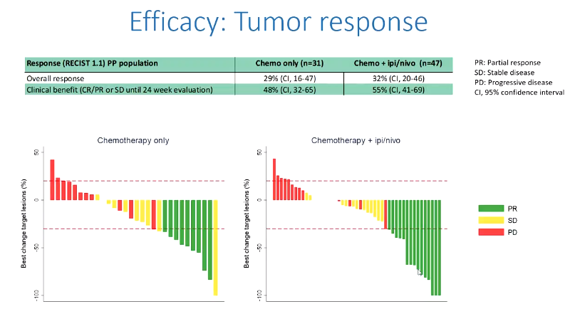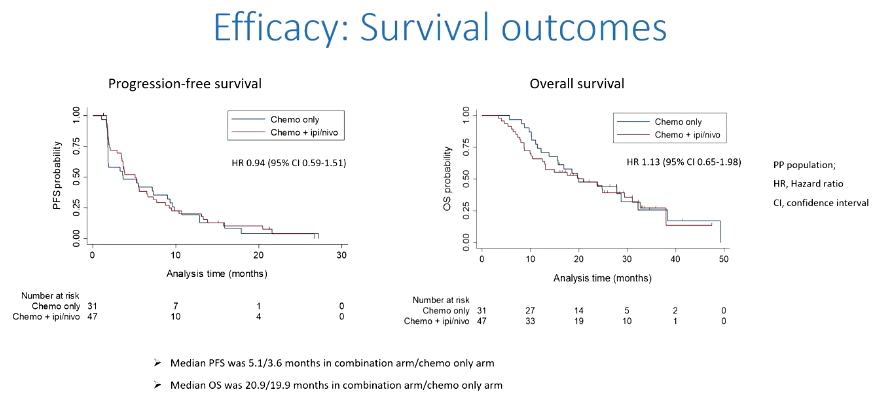 在化疗中同时添加ipi/nivo并没有显示出任何明显的获益。接受ipi/nivo的患者有更多的不良事件,但毒性是可控的。生物标志物分析对于确定是否需要对选定的亚组进行进一步研究非常重要。