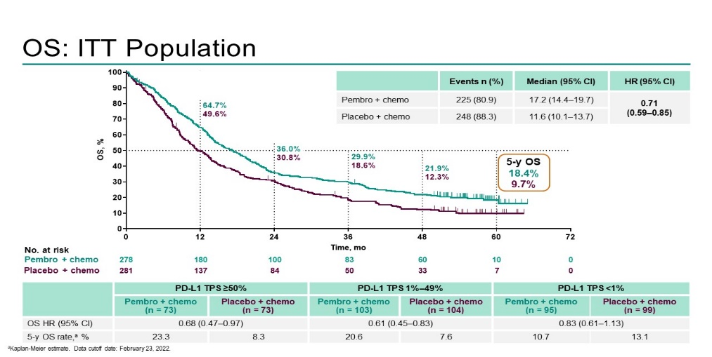 研究结果:共计616例患者入组,免疫治疗组和单纯化疗组分别有410例和206例患者,数据截止时间为2022年3月,中位随访时间64.6个月,57.4%的患者交叉接受免疫治疗。两组中位OS分别为22.0个月和10.6个月,HR=0.60,5年OS率分别为19.4%和11.3%;中位PFS分别为9.0个月和4.9个月,HR=0.50,在至少接受一剂研究药物治疗的患者中,3度及以上不良反应发生率分别为72.8%和67.3%。在57例完成35周期Pembrolizumab治疗的患者中,ORR为86.0%,完成治疗后的3年OS率为71.9%。