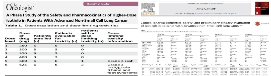 埃克替尼的早期临床研究展示了非常有益的安全性数据。在一项剂量爬坡研究中,研究者给予四种不同剂量的埃克替尼治疗:100mg、每日两次;150mg、每日两次;125mg、每日三次;200mg、每日两次。每一个剂量组的患者均未出现超过2例的3级及以上不良反应。随后,研究者又进行了更高剂量的爬坡,从“250mg、每日三次”开始,直到“625mg、每日三次”,最终确定的最大耐受剂量为“500mg、每日三次”的剂量,而这一剂量与埃克替尼获批的临床常规给药剂量“125mg、口服、每日三次”具有较大的差距。这不仅给埃克替尼留下了足够的安全窗,同时也为后续开展加量治疗及联合治疗提供了充分的数据。