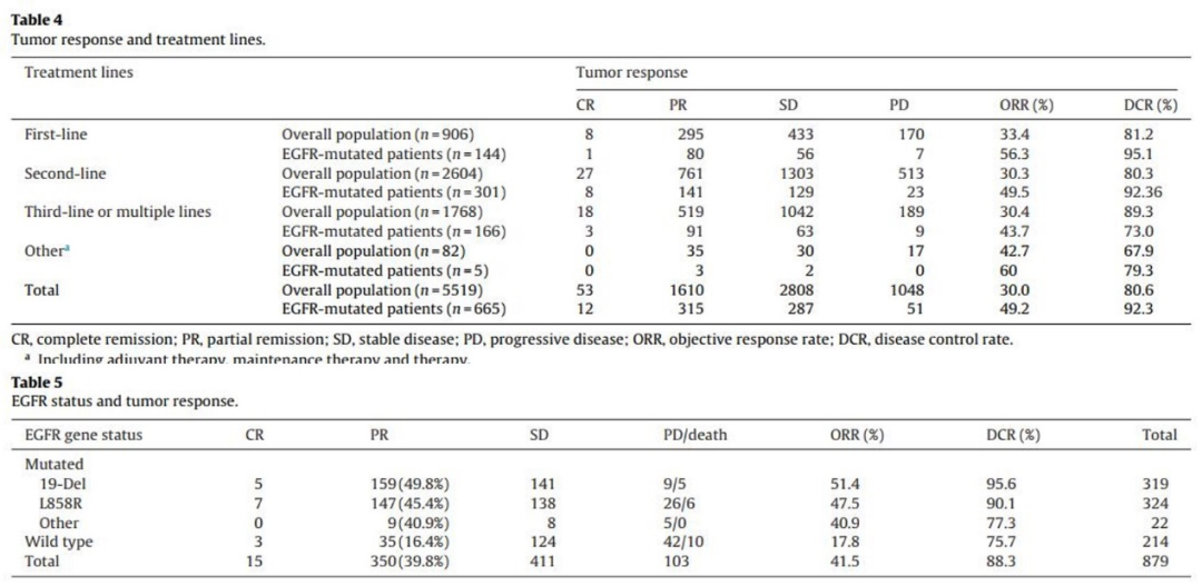 由于在临床试验中患者的入排有严格的标准,因此临床试验中的数据能否在真实世界中复现十分重要。随后,埃克替尼又在真实世界中开展了大型的上市后IV期临床研究。这项研究共有6087例患者登记筛查,其中5549例患者纳入安全性及肿瘤响应评估,接近30%的患者年龄超过70周岁,任何级别的药物相关不良反应发生率为31.5%,最常见的为皮疹(17.4%)及腹泻(8.5%),仅有3例患者出现间质性肺炎。在665例携带EGFR敏感基因突变的可评估患者中,ORR和DCR分别为49.2%和92.3%,治疗线数并未显著影响患者疗效。一线、二线及三线接受治疗的患者ORR分别为56.3%、49.5%和43.7%,DCR分别为95.1%、92.3%和73.0%。大型真实世界研究的数据,为患者应用埃克替尼提供了更加充分的依据。