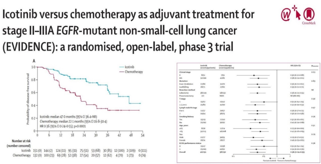 在晚期治疗领域,埃克替尼已经展示了良好的疗效及安全性,那么在术后辅助治疗领域,埃克替尼的疗效如何呢?在这一领域,埃克替尼是唯一一款获批的一代靶向药物,研究数据发表于The Lancet Respiratory Medicine。给予埃克替尼术后辅助治疗2年后,中位DFS由标准化疗组的22.1个月延长至47.0个月,降低复发风险达64%,3年的DFS率分别为63.9%和32.5%。在亚组分析中,评估为N0-1和N2的患者,HR值均为0.36,均展现了获益;而不同T分期及手术方式的患者,同样可以从这样的治疗中获益或者展现获益的趋势。在EVIDENCE研究中,化疗组的严重不良反应发生率达到14%,而埃克替尼组仅为1%。基于此,埃克替尼成为首个、也是目前唯一一个获批,用于术后辅助治疗的一代EGFR-TKI药物。