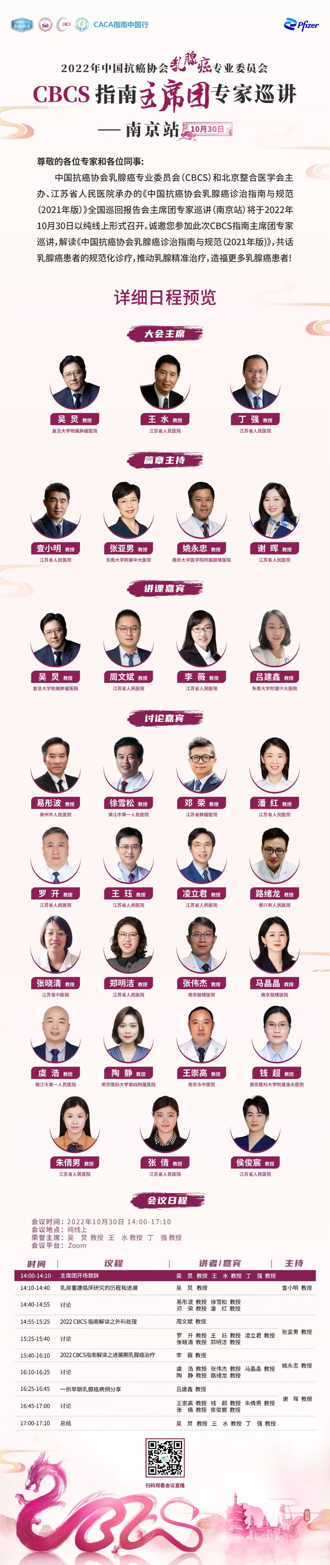 2022年10月30日,由中国抗癌协会乳腺癌专业委员会(CBCS)、北京整合医学会主办,江苏省人民医院承办的“2022中国抗癌协会乳腺癌专业委员会《中国抗癌协会乳腺癌诊治指南与规范(2021年版)》(《CBCS指南》)主席团巡讲——南京站”隆重举行。