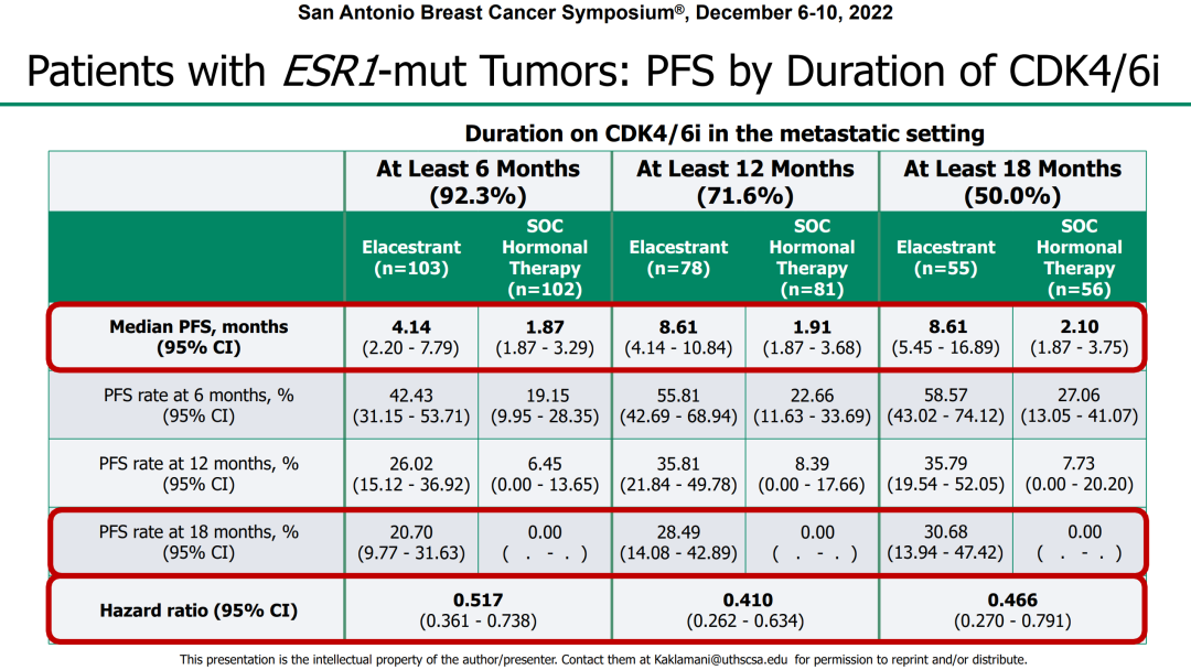 但今年我们观察了CDK4/6抑制剂的既往治疗,并试图根据既往治疗持续的时间来观察结果。我们发现在CDK4/6抑制剂已持续至少12个月的女性中,与标准内分泌治疗相比,这些女性使用elacestrant治疗的结果有更具临床意义的改善,尤其是在ESR1突变的肿瘤中。在接受CDK4/6抑制剂治疗超过12个月且肿瘤为ESR1突变的女性中,elacestrant的中位PFS为8.6个月,而单药内分泌治疗的中位PFS仅为1.9个月。FDA正在评估该药物,我们将看看它是否获得批准,但根据这些数据,我认为有一个患者群体,尤其是ESR1突变以及CDK4/6i超过12个月的患者,将从elacestrant治疗中获得显著的益处。