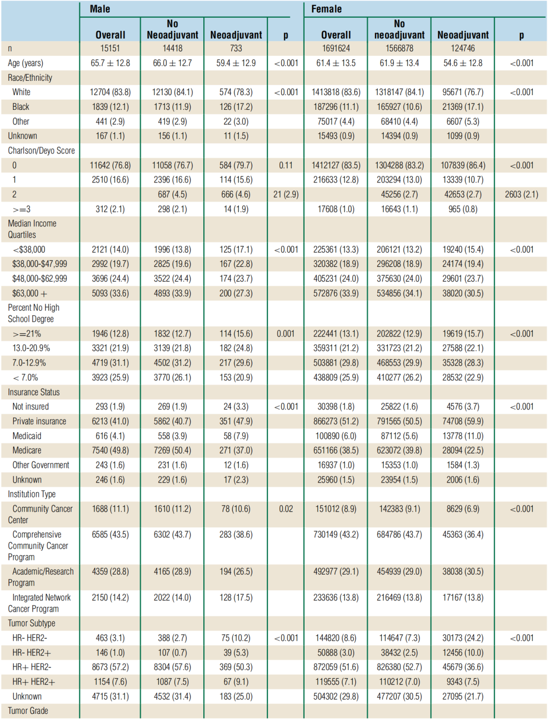 研究人员对2004年至2017年美国国家癌症数据库(NCDB)的的数据进行了回顾性分析。研究人员首先确定了所有诊断为非转移性侵袭性乳腺癌患者(AJCC临床期Ⅰ-Ⅲ期),并根据性别、临床肿瘤分期(非局部晚期cT1/2;局部晚期cT3/4),以及患者是否接受了NT进行了分层。