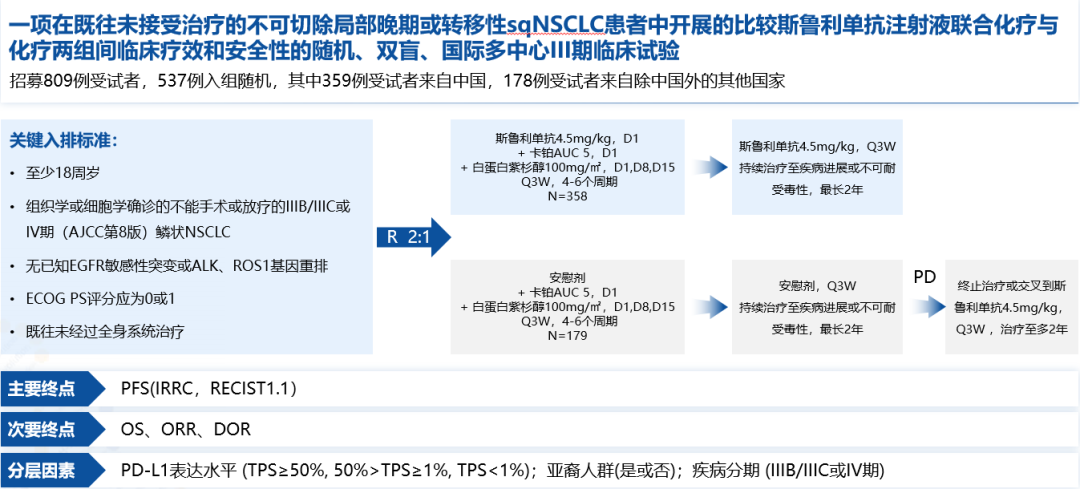 ASTRUM-004研究是一项在既往未经治疗的不可切除局部晚期或转移性sqNSCLC患者中开展的,比较斯鲁利单抗联合化疗与化疗两组间临床疗效和安全性的随机、双盲、国际多中心III期临床试验。该研究的主要终点是无进展生存期(PFS),关键次要终点是总生存期(OS),其他次要终点包括客观缓解率(ORR)和持续缓解时间(DOR)。