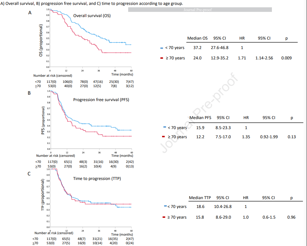 图1.两个年龄组的(A)总生存期,(B)无进展生存期,(C)疾病进展时间