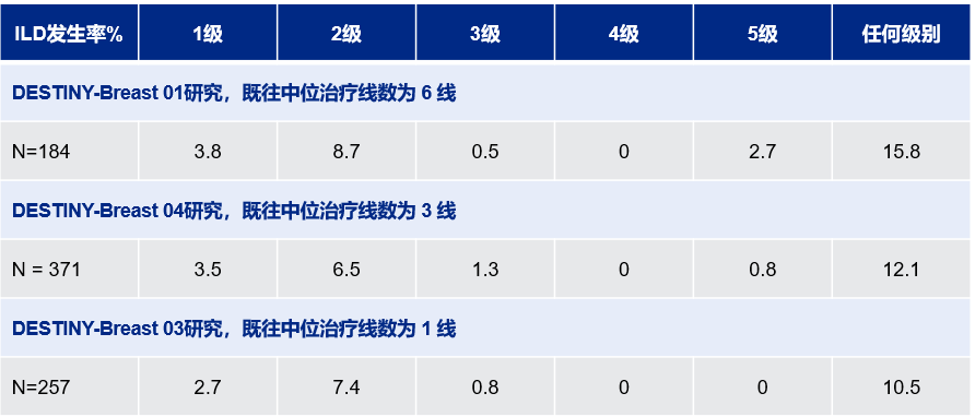 有一些特征性的毒副反应值得关注,例如间质性肺病(ILD)/非感染性肺炎。DESTINY-Breast01研究中有4例患者因ILD/非感染性肺炎死亡而引起大家关注,但该研究入组患者大多比较靠后线,T-DXd组的既往中位治疗达到了6线,这类患者本身的脏器储备功能就很差,合并症很多,所以出现ILD/非感染性肺炎后可能导致比较严重的后果。在后期的临床试验中,由于管理上的改进,包括更加科学的筛查评估或预处理,T-DXd治疗的ILD/非感染性肺炎事件整体上是可控的。例如DESTINY-Breast03研究中,没有发生3级以上的ILD/肺感染性肺炎事件。这表明T-DXd的安全性是良好的,即使ILD/非感染性肺炎也是一些相对的小概率事件,通过我们积极的管理是可以控制的。