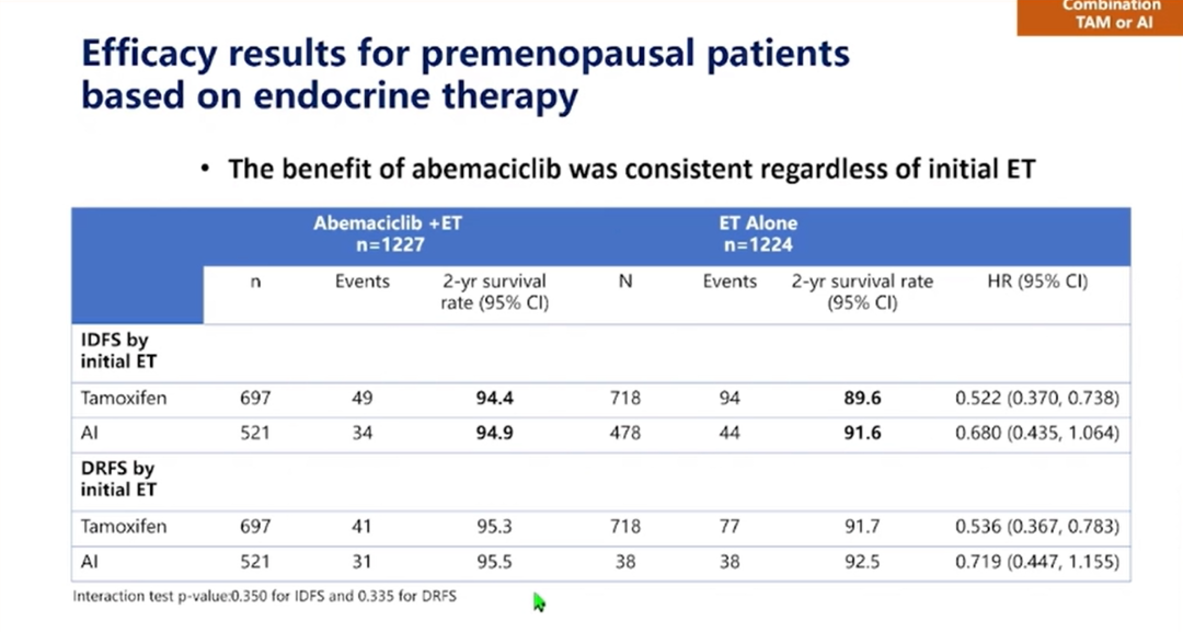 第四,该研究中大约有30%的患者内分泌治疗选择了TAM,大约70%为AI。针对绝经前患者的亚组分析显示,联合TAM(HR 0.522)和联合AI(HR 0.680)均有IDFS获益,但TAM的获益程度更大。而以往的ATAC、BIG 1-98等研究提示,绝经后患者使用AI辅助治疗可相较于TAM降低复发风险。