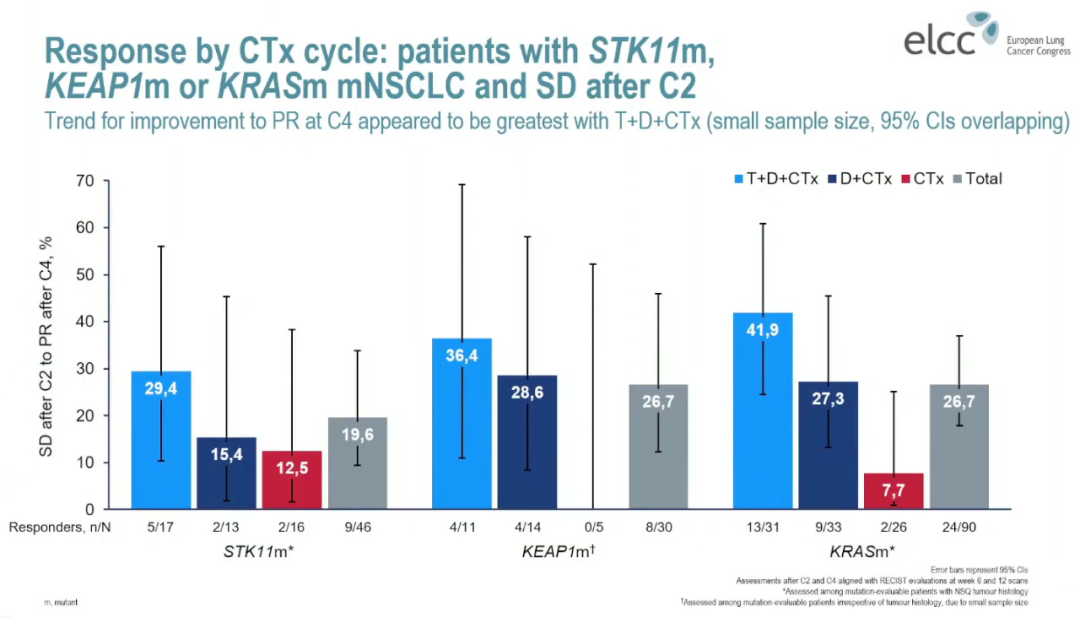 STK11、KEAP1和KRAS突变人群:值得注意的是,携带STK11、KEAP1和KRAS突变的患者接受三联组治疗后,从第2周期后SD改善至第4周期后PR的患者分别占29.4%(n=5/17)、36.4%(n=4/11)和41.9%(n=13/31)。然而,本试验的样本量小且置信区间重叠,因此研究者无法得出明确结论。在度伐利尤单抗+化疗组中,携带STK11、KEAP1和KRAS突变人群从第2周期后SD到第4周期后PR的转变率分别为15.4%(n=2/13)、28.6%(n=4/14)和27.3%(n=9/33);而单纯化疗组分别为12.5%(2/16)、0%(0/5)和7.7%(2/26)。